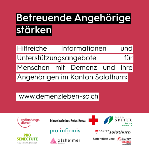 Um auf dieses Engagement aufmerksam zu machen, schliessen sich die Solothurner Unterstützungsorganisationen anlässlich des Tags für betreuende Angehörige zusammen. Gemeinsam setzen wir uns dafür ein, dass Betroffene nicht mit dieser verantwortungsvollen Aufgabe alleingelassen werden.