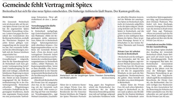 Die Gemeinde Breitenbach hat die Spitex-Vergabe umstritten geändert, sodass aktuell kein gültiger Vertrag besteht. Der Kanton Solothurn musste einschreiten und rückwirkend eine provisorische Tarifordnung festlegen, um Abrechnungen zu ermöglichen. Trotz des Chaos bleibt die Versorgung der Bevölkerung vorerst gesichert.